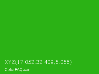 XYZ 17.052,32.409,6.066 Color is a normal green color and the nearest color is Slimy Green #299617. Hex code #2bb215 and RGB value is rgb(43,178,21). In RGB color space, this color is composed of 17% red, 70% green, 8% blue, In CMYK color space, this color is composed of 76% cyan, 0% magenta, 88% yellow , 30% black , In HSL color space, this color has a hue angle of 112° , 79% saturation and 39% lightness.