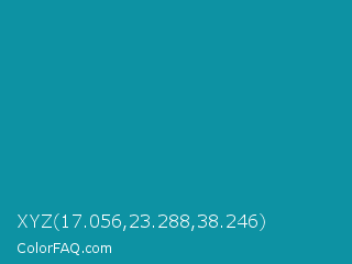 XYZ 17.056,23.288,38.246 Color is a normal cyan color and the nearest color is Viridian Green #009698. Hex code #0d92a3 and RGB value is rgb(13,146,163). In RGB color space, this color is composed of 5% red, 57% green, 64% blue, In CMYK color space, this color is composed of 92% cyan, 10% magenta, 0% yellow , 36% black , In HSL color space, this color has a hue angle of 187° , 85% saturation and 35% lightness.