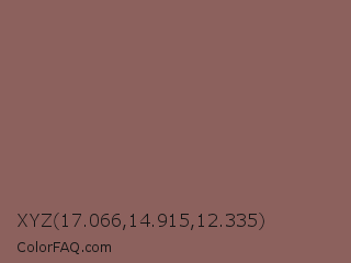 XYZ 17.066,14.915,12.335 Color is a normal red color and the nearest color is Rose Taupe #905d5d. Hex code #8c615d and RGB value is rgb(140,97,93). In RGB color space, this color is composed of 55% red, 38% green, 36% blue, In CMYK color space, this color is composed of 0% cyan, 31% magenta, 34% yellow , 45% black , In HSL color space, this color has a hue angle of 5° , 20% saturation and 46% lightness.