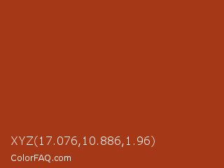XYZ 17.076,10.886,1.96 Color is a normal red color and the nearest color is Cognac #9f381d. Hex code #a53816 and RGB value is rgb(165,56,22). In RGB color space, this color is composed of 65% red, 22% green, 9% blue, In CMYK color space, this color is composed of 0% cyan, 66% magenta, 87% yellow , 35% black , In HSL color space, this color has a hue angle of 14° , 76% saturation and 37% lightness.
