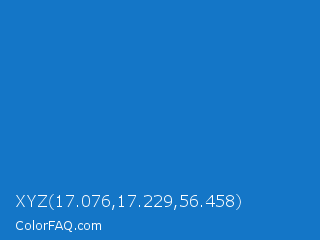 XYZ 17.076,17.229,56.458 Color is a normal blue color and the nearest color is Bright Navy Blue #1974d2. Hex code #1476c7 and RGB value is rgb(20,118,199). In RGB color space, this color is composed of 8% red, 46% green, 78% blue, In CMYK color space, this color is composed of 90% cyan, 41% magenta, 0% yellow , 22% black , In HSL color space, this color has a hue angle of 207° , 82% saturation and 43% lightness.