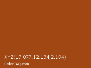 XYZ 17.077,12.134,2.104 Color is a normal orange color and the nearest color is Hawaiian Tan #9d5616. Hex code #a14714 and RGB value is rgb(161,71,20). In RGB color space, this color is composed of 63% red, 28% green, 8% blue, In CMYK color space, this color is composed of 0% cyan, 56% magenta, 88% yellow , 37% black , In HSL color space, this color has a hue angle of 22° , 78% saturation and 35% lightness.