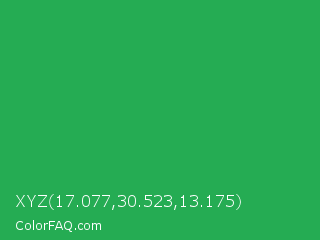 XYZ 17.077,30.523,13.175 Color is a normal green color and the nearest color is Chateau Green #40a860. Hex code #25ac53 and RGB value is rgb(37,172,83). In RGB color space, this color is composed of 15% red, 67% green, 33% blue, In CMYK color space, this color is composed of 78% cyan, 0% magenta, 52% yellow , 33% black , In HSL color space, this color has a hue angle of 140° , 65% saturation and 41% lightness.