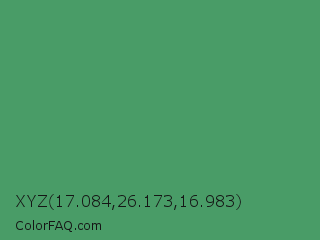 XYZ 17.084,26.173,16.983 Color is a normal green color and the nearest color is Fruit Salad #4f9d5d. Hex code #499c67 and RGB value is rgb(73,156,103). In RGB color space, this color is composed of 29% red, 61% green, 40% blue, In CMYK color space, this color is composed of 53% cyan, 0% magenta, 34% yellow , 39% black , In HSL color space, this color has a hue angle of 142° , 36% saturation and 45% lightness.