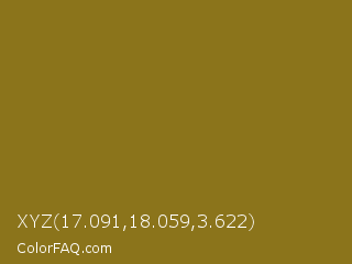 XYZ 17.091,18.059,3.622 Color is a normal yellow color and the nearest color is Sand Dune #967117. Hex code #8b741b and RGB value is rgb(139,116,27). In RGB color space, this color is composed of 55% red, 45% green, 11% blue, In CMYK color space, this color is composed of 0% cyan, 17% magenta, 81% yellow , 45% black , In HSL color space, this color has a hue angle of 48° , 67% saturation and 33% lightness.