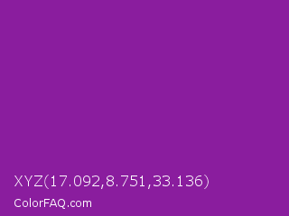 XYZ 17.092,8.751,33.136 Color is a normal purple color and the nearest color is Violet Eggplant #991199. Hex code #8a1d9e and RGB value is rgb(138,29,158). In RGB color space, this color is composed of 54% red, 11% green, 62% blue, In CMYK color space, this color is composed of 13% cyan, 82% magenta, 0% yellow , 38% black , In HSL color space, this color has a hue angle of 291° , 69% saturation and 37% lightness.