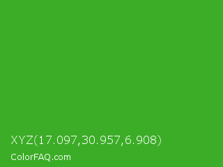 XYZ 17.097,30.957,6.908 Color is a normal green color and the nearest color is Wageningen Green #34b233. Hex code #3bad26 and RGB value is rgb(59,173,38). In RGB color space, this color is composed of 23% red, 68% green, 15% blue, In CMYK color space, this color is composed of 66% cyan, 0% magenta, 78% yellow , 32% black , In HSL color space, this color has a hue angle of 111° , 64% saturation and 41% lightness.