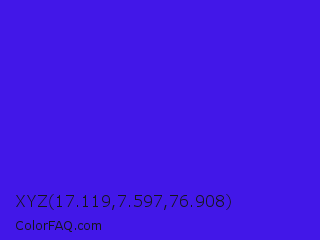 XYZ 17.119,7.597,76.908 Color is a normal indigo color and the nearest color is Han Purple #5218fa. Hex code #4217e8 and RGB value is rgb(66,23,232). In RGB color space, this color is composed of 26% red, 9% green, 91% blue, In CMYK color space, this color is composed of 72% cyan, 90% magenta, 0% yellow , 9% black , In HSL color space, this color has a hue angle of 252° , 82% saturation and 50% lightness.