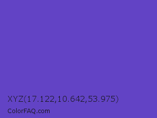 XYZ 17.122,10.642,53.975 Color is a normal indigo color and the nearest color is Iris #5a4fcf. Hex code #6243c5 and RGB value is rgb(98,67,197). In RGB color space, this color is composed of 38% red, 26% green, 77% blue, In CMYK color space, this color is composed of 50% cyan, 66% magenta, 0% yellow , 23% black , In HSL color space, this color has a hue angle of 254° , 53% saturation and 52% lightness.