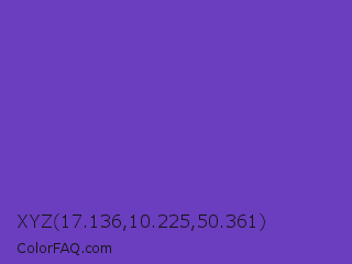 XYZ 17.136,10.225,50.361 Color is a normal violet color and the nearest color is Purple Heart Crayola #652dc1. Hex code #6b3dbf and RGB value is rgb(107,61,191). In RGB color space, this color is composed of 42% red, 24% green, 75% blue, In CMYK color space, this color is composed of 44% cyan, 68% magenta, 0% yellow , 25% black , In HSL color space, this color has a hue angle of 261° , 52% saturation and 49% lightness.
