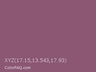 XYZ 17.15,13.543,17.93 Color is a normal rose color and the nearest color is Sugar Plum #914e75. Hex code #8b5773 and RGB value is rgb(139,87,115). In RGB color space, this color is composed of 55% red, 34% green, 45% blue, In CMYK color space, this color is composed of 0% cyan, 37% magenta, 17% yellow , 45% black , In HSL color space, this color has a hue angle of 328° , 23% saturation and 44% lightness.