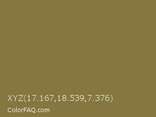 XYZ 17.167,18.539,7.376 Color is a normal yellow color and the nearest color is Old Moss Green #867e36. Hex code #85773f and RGB value is rgb(133,119,63). In RGB color space, this color is composed of 52% red, 47% green, 25% blue, In CMYK color space, this color is composed of 0% cyan, 11% magenta, 53% yellow , 48% black , In HSL color space, this color has a hue angle of 48° , 36% saturation and 38% lightness.