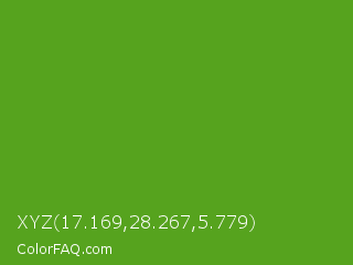 XYZ 17.169,28.267,5.779 Color is a normal green color and the nearest color is Vida Loca #549019. Hex code #56a31e and RGB value is rgb(86,163,30). In RGB color space, this color is composed of 34% red, 64% green, 12% blue, In CMYK color space, this color is composed of 47% cyan, 0% magenta, 82% yellow , 36% black , In HSL color space, this color has a hue angle of 95° , 69% saturation and 38% lightness.