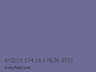 XYZ 17.174,16.178,31.072 Color is a normal indigo color and the nearest color is Dark Blue Gray #666699. Hex code #6d6c96 and RGB value is rgb(109,108,150). In RGB color space, this color is composed of 43% red, 42% green, 59% blue, In CMYK color space, this color is composed of 27% cyan, 28% magenta, 0% yellow , 41% black , In HSL color space, this color has a hue angle of 241° , 17% saturation and 51% lightness.