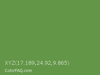 XYZ 17.189,24.92,9.865 Color is a normal green color and the nearest color is Palm Leaf #6f9940. Hex code #639647 and RGB value is rgb(99,150,71). In RGB color space, this color is composed of 39% red, 59% green, 28% blue, In CMYK color space, this color is composed of 34% cyan, 0% magenta, 53% yellow , 41% black , In HSL color space, this color has a hue angle of 99° , 36% saturation and 43% lightness.