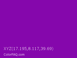 XYZ 17.195,8.117,39.69 Color is a normal purple color and the nearest color is Violet RYB #8601af. Hex code #8507ac and RGB value is rgb(133,7,172). In RGB color space, this color is composed of 52% red, 3% green, 67% blue, In CMYK color space, this color is composed of 23% cyan, 96% magenta, 0% yellow , 33% black , In HSL color space, this color has a hue angle of 286° , 92% saturation and 35% lightness.