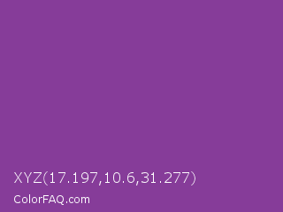 XYZ 17.197,10.6,31.277 Color is a normal purple color and the nearest color is Vivid Violet #803790. Hex code #863c99 and RGB value is rgb(134,60,153). In RGB color space, this color is composed of 53% red, 24% green, 60% blue, In CMYK color space, this color is composed of 12% cyan, 61% magenta, 0% yellow , 40% black , In HSL color space, this color has a hue angle of 288° , 44% saturation and 42% lightness.