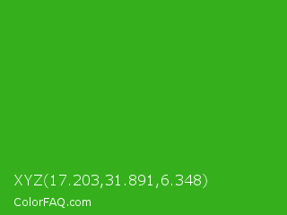 XYZ 17.203,31.891,6.348 Color is a normal green color and the nearest color is Wageningen Green #34b233. Hex code #35b01c and RGB value is rgb(53,176,28). In RGB color space, this color is composed of 21% red, 69% green, 11% blue, In CMYK color space, this color is composed of 70% cyan, 0% magenta, 84% yellow , 31% black , In HSL color space, this color has a hue angle of 110° , 73% saturation and 40% lightness.