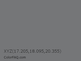 XYZ 17.205,18.095,20.355 Color is a normal blue color and the nearest color is Sonic Silver #757575. Hex code #757678 and RGB value is rgb(117,118,120). In RGB color space, this color is composed of 46% red, 46% green, 47% blue, In CMYK color space, this color is composed of 3% cyan, 2% magenta, 0% yellow , 53% black , In HSL color space, this color has a hue angle of 220° , 1% saturation and 46% lightness.