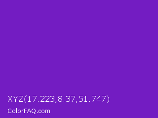 XYZ 17.223,8.37,51.747 Color is a normal purple color and the nearest color is Purple Heart Crayola #652dc1. Hex code #731cc2 and RGB value is rgb(115,28,194). In RGB color space, this color is composed of 45% red, 11% green, 76% blue, In CMYK color space, this color is composed of 41% cyan, 86% magenta, 0% yellow , 24% black , In HSL color space, this color has a hue angle of 271° , 75% saturation and 44% lightness.