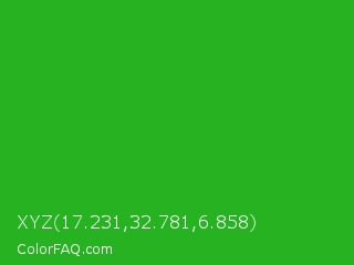 XYZ 17.231,32.781,6.858 Color is a normal green color and the nearest color is Wageningen Green #34b233. Hex code #27b321 and RGB value is rgb(39,179,33). In RGB color space, this color is composed of 15% red, 70% green, 13% blue, In CMYK color space, this color is composed of 78% cyan, 0% magenta, 82% yellow , 30% black , In HSL color space, this color has a hue angle of 118° , 69% saturation and 42% lightness.