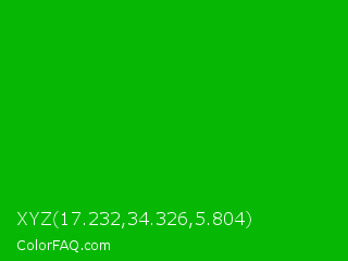 XYZ 17.232,34.326,5.804 Color is a normal green color and the nearest color is Islamic Green #009000. Hex code #06b803 and RGB value is rgb(6,184,3). In RGB color space, this color is composed of 2% red, 72% green, 1% blue, In CMYK color space, this color is composed of 97% cyan, 0% magenta, 98% yellow , 28% black , In HSL color space, this color has a hue angle of 119° , 97% saturation and 37% lightness.