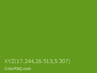 XYZ 17.244,26.513,5.307 Color is a normal green color and the nearest color is Christi #67a712. Hex code #639c1c and RGB value is rgb(99,156,28). In RGB color space, this color is composed of 39% red, 61% green, 11% blue, In CMYK color space, this color is composed of 37% cyan, 0% magenta, 82% yellow , 39% black , In HSL color space, this color has a hue angle of 87° , 70% saturation and 36% lightness.