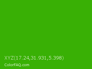 XYZ 17.24,31.931,5.398 Color is a normal green color and the nearest color is Kelly Green #4cbb17. Hex code #39b005 and RGB value is rgb(57,176,5). In RGB color space, this color is composed of 22% red, 69% green, 2% blue, In CMYK color space, this color is composed of 68% cyan, 0% magenta, 97% yellow , 31% black , In HSL color space, this color has a hue angle of 102° , 94% saturation and 35% lightness.