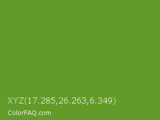 XYZ 17.285,26.263,6.349 Color is a normal green color and the nearest color is Olive Drab #6b8e23. Hex code #639b2a and RGB value is rgb(99,155,42). In RGB color space, this color is composed of 39% red, 61% green, 16% blue, In CMYK color space, this color is composed of 36% cyan, 0% magenta, 73% yellow , 39% black , In HSL color space, this color has a hue angle of 90° , 57% saturation and 39% lightness.