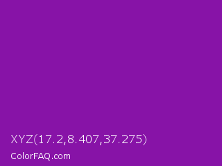 XYZ 17.2,8.407,37.275 Color is a normal purple color and the nearest color is Violet RYB #8601af. Hex code #8713a7 and RGB value is rgb(135,19,167). In RGB color space, this color is composed of 53% red, 7% green, 65% blue, In CMYK color space, this color is composed of 19% cyan, 89% magenta, 0% yellow , 35% black , In HSL color space, this color has a hue angle of 287° , 80% saturation and 36% lightness.