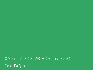 XYZ 17.302,28.896,16.722 Color is a normal green color and the nearest color is Chateau Green #40a860. Hex code #33a664 and RGB value is rgb(51,166,100). In RGB color space, this color is composed of 20% red, 65% green, 39% blue, In CMYK color space, this color is composed of 69% cyan, 0% magenta, 40% yellow , 35% black , In HSL color space, this color has a hue angle of 146° , 53% saturation and 43% lightness.
