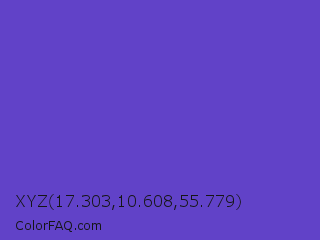 XYZ 17.303,10.608,55.779 Color is a normal indigo color and the nearest color is Iris #5a4fcf. Hex code #6142c8 and RGB value is rgb(97,66,200). In RGB color space, this color is composed of 38% red, 26% green, 78% blue, In CMYK color space, this color is composed of 52% cyan, 67% magenta, 0% yellow , 22% black , In HSL color space, this color has a hue angle of 254° , 55% saturation and 52% lightness.
