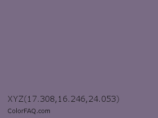 XYZ 17.308,16.246,24.053 Color is a normal purple color and the nearest color is Rum #796989. Hex code #796b84 and RGB value is rgb(121,107,132). In RGB color space, this color is composed of 47% red, 42% green, 52% blue, In CMYK color space, this color is composed of 8% cyan, 19% magenta, 0% yellow , 48% black , In HSL color space, this color has a hue angle of 274° , 10% saturation and 47% lightness.
