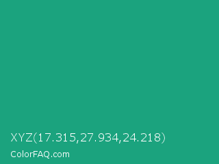 XYZ 17.315,27.934,24.218 Color is a normal cyan color and the nearest color is Green Crayola #1cac78. Hex code #1ba37e and RGB value is rgb(27,163,126). In RGB color space, this color is composed of 11% red, 64% green, 49% blue, In CMYK color space, this color is composed of 83% cyan, 0% magenta, 23% yellow , 36% black , In HSL color space, this color has a hue angle of 164° , 72% saturation and 37% lightness.