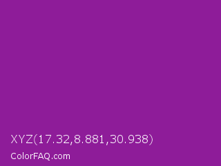 XYZ 17.32,8.881,30.938 Color is a normal magenta color and the nearest color is Violet Eggplant #991199. Hex code #8e1c99 and RGB value is rgb(142,28,153). In RGB color space, this color is composed of 56% red, 11% green, 60% blue, In CMYK color space, this color is composed of 7% cyan, 82% magenta, 0% yellow , 40% black , In HSL color space, this color has a hue angle of 295° , 69% saturation and 35% lightness.