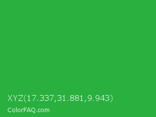 XYZ 17.337,31.881,9.943 Color is a normal green color and the nearest color is Wageningen Green #34b233. Hex code #29b03f and RGB value is rgb(41,176,63). In RGB color space, this color is composed of 16% red, 69% green, 25% blue, In CMYK color space, this color is composed of 77% cyan, 0% magenta, 64% yellow , 31% black , In HSL color space, this color has a hue angle of 130° , 62% saturation and 43% lightness.
