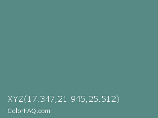 XYZ 17.347,21.945,25.512 Color is a normal cyan color and the nearest color is Wintergreen Dream #56887d. Hex code #588a85 and RGB value is rgb(88,138,133). In RGB color space, this color is composed of 35% red, 54% green, 52% blue, In CMYK color space, this color is composed of 36% cyan, 0% magenta, 4% yellow , 46% black , In HSL color space, this color has a hue angle of 174° , 22% saturation and 44% lightness.