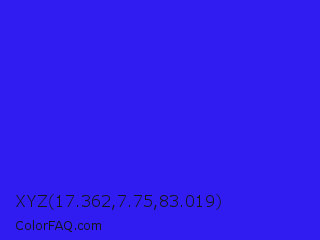 XYZ 17.362,7.75,83.019 Color is a normal indigo color and the nearest color is Bluebonnet #1c1cf0. Hex code #301cf0 and RGB value is rgb(48,28,240). In RGB color space, this color is composed of 19% red, 11% green, 94% blue, In CMYK color space, this color is composed of 80% cyan, 88% magenta, 0% yellow , 6% black , In HSL color space, this color has a hue angle of 246° , 88% saturation and 53% lightness.