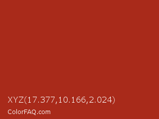 XYZ 17.377,10.166,2.024 Color is a normal red color and the nearest color is Roof Terracotta #a62f20. Hex code #a92a1a and RGB value is rgb(169,42,26). In RGB color space, this color is composed of 66% red, 16% green, 10% blue, In CMYK color space, this color is composed of 0% cyan, 75% magenta, 85% yellow , 34% black , In HSL color space, this color has a hue angle of 7° , 73% saturation and 38% lightness.