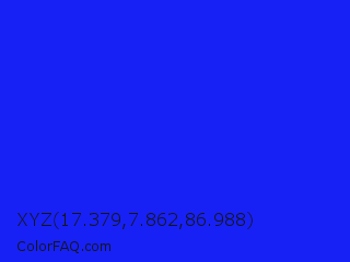 XYZ 17.379,7.862,86.988 Color is a normal blue color and the nearest color is Bluebonnet #1c1cf0. Hex code #1721f5 and RGB value is rgb(23,33,245). In RGB color space, this color is composed of 9% red, 13% green, 96% blue, In CMYK color space, this color is composed of 91% cyan, 87% magenta, 0% yellow , 4% black , In HSL color space, this color has a hue angle of 237° , 92% saturation and 53% lightness.