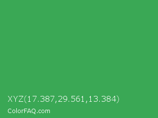 XYZ 17.387,29.561,13.384 Color is a normal green color and the nearest color is Chateau Green #40a860. Hex code #3aa855 and RGB value is rgb(58,168,85). In RGB color space, this color is composed of 23% red, 66% green, 33% blue, In CMYK color space, this color is composed of 65% cyan, 0% magenta, 49% yellow , 34% black , In HSL color space, this color has a hue angle of 135° , 49% saturation and 44% lightness.