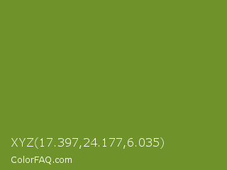 XYZ 17.397,24.177,6.035 Color is a normal green color and the nearest color is Olive Drab #6b8e23. Hex code #70922b and RGB value is rgb(112,146,43). In RGB color space, this color is composed of 44% red, 57% green, 17% blue, In CMYK color space, this color is composed of 23% cyan, 0% magenta, 71% yellow , 43% black , In HSL color space, this color has a hue angle of 80° , 54% saturation and 37% lightness.