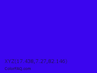 XYZ 17.438,7.27,82.146 Color is a normal indigo color and the nearest color is Electric Ultramarine #3f00ff. Hex code #3b05ef and RGB value is rgb(59,5,239). In RGB color space, this color is composed of 23% red, 2% green, 94% blue, In CMYK color space, this color is composed of 75% cyan, 98% magenta, 0% yellow , 6% black , In HSL color space, this color has a hue angle of 254° , 96% saturation and 48% lightness.