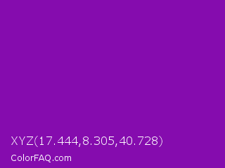 XYZ 17.444,8.305,40.728 Color is a normal purple color and the nearest color is Violet RYB #8601af. Hex code #850cae and RGB value is rgb(133,12,174). In RGB color space, this color is composed of 52% red, 5% green, 68% blue, In CMYK color space, this color is composed of 24% cyan, 93% magenta, 0% yellow , 32% black , In HSL color space, this color has a hue angle of 285° , 87% saturation and 36% lightness.