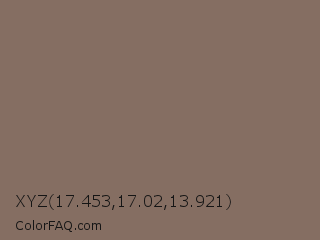 XYZ 17.453,17.02,13.921 Color is a normal orange color and the nearest color is Sand Dune #826f65. Hex code #856e62 and RGB value is rgb(133,110,98). In RGB color space, this color is composed of 52% red, 43% green, 38% blue, In CMYK color space, this color is composed of 0% cyan, 17% magenta, 26% yellow , 48% black , In HSL color space, this color has a hue angle of 21° , 15% saturation and 45% lightness.