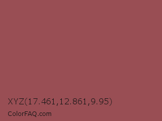 XYZ 17.461,12.861,9.95 Color is a normal red color and the nearest color is Middle Red Purple #a55353. Hex code #994e54 and RGB value is rgb(153,78,84). In RGB color space, this color is composed of 60% red, 31% green, 33% blue, In CMYK color space, this color is composed of 0% cyan, 49% magenta, 45% yellow , 40% black , In HSL color space, this color has a hue angle of 355° , 32% saturation and 45% lightness.