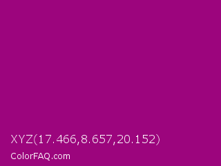 XYZ 17.466,8.657,20.152 Color is a normal magenta color and the nearest color is Flirt #a2006d. Hex code #9c057d and RGB value is rgb(156,5,125). In RGB color space, this color is composed of 61% red, 2% green, 49% blue, In CMYK color space, this color is composed of 0% cyan, 97% magenta, 20% yellow , 39% black , In HSL color space, this color has a hue angle of 312° , 94% saturation and 32% lightness.
