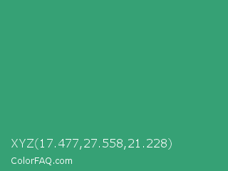 XYZ 17.477,27.558,21.228 Color is a normal green color and the nearest color is Ocean Green #41aa78. Hex code #36a175 and RGB value is rgb(54,161,117). In RGB color space, this color is composed of 21% red, 63% green, 46% blue, In CMYK color space, this color is composed of 66% cyan, 0% magenta, 27% yellow , 37% black , In HSL color space, this color has a hue angle of 155° , 50% saturation and 42% lightness.