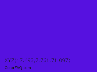 XYZ 17.493,7.761,71.097 Color is a normal indigo color and the nearest color is Han Purple #5218fa. Hex code #5611e0 and RGB value is rgb(86,17,224). In RGB color space, this color is composed of 34% red, 7% green, 88% blue, In CMYK color space, this color is composed of 62% cyan, 92% magenta, 0% yellow , 12% black , In HSL color space, this color has a hue angle of 260° , 86% saturation and 47% lightness.