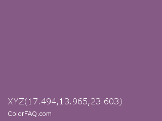 XYZ 17.494,13.965,23.603 Color is a normal magenta color and the nearest color is Chinese Violet #856088. Hex code #855a84 and RGB value is rgb(133,90,132). In RGB color space, this color is composed of 52% red, 35% green, 52% blue, In CMYK color space, this color is composed of 0% cyan, 32% magenta, 1% yellow , 48% black , In HSL color space, this color has a hue angle of 301° , 19% saturation and 44% lightness.